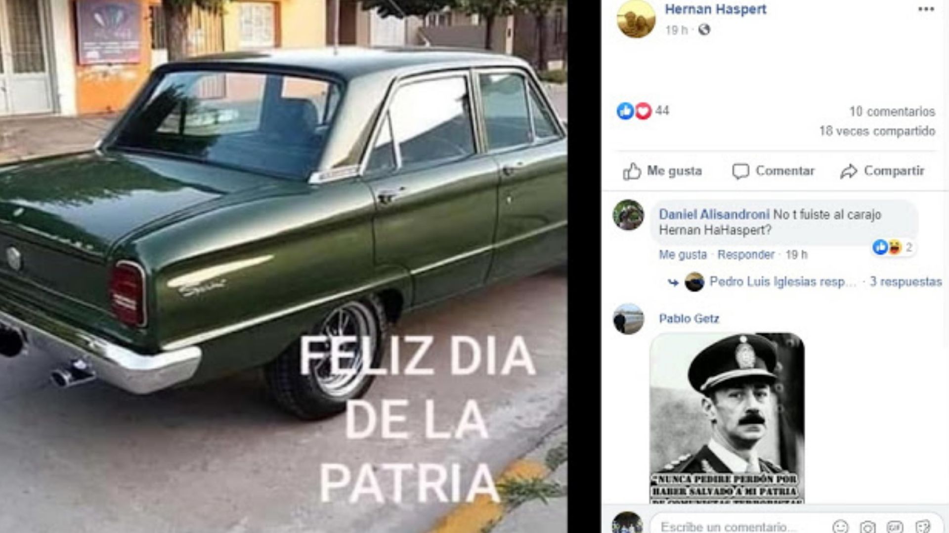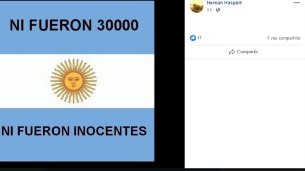 Sucedió en la localidad de Guatraché, a dos horas de Bahía Blanca, donde ex el candidato a concejal por Juntos por el Cambio publicó en las redes el mismo 24 de marzo: ¡Feliz Día de la Patria! sobre la foto de un Falcon verde, y ¡Ni fueron 30 mil, ni fueron inocentes! sobre una bandera Argentina.