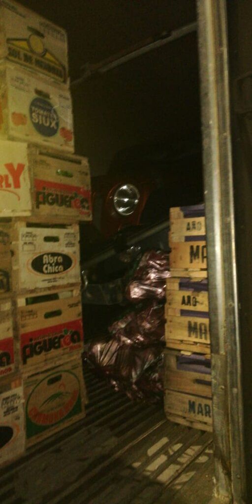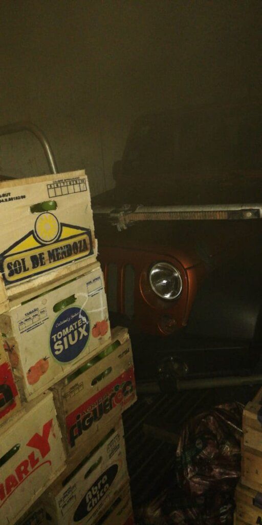 Es que si bien había fruta y verdura, tal cual lo esperado; en el fondo de la unidad había un hermoso Jeep, el cual de milagro no sufrió daños.