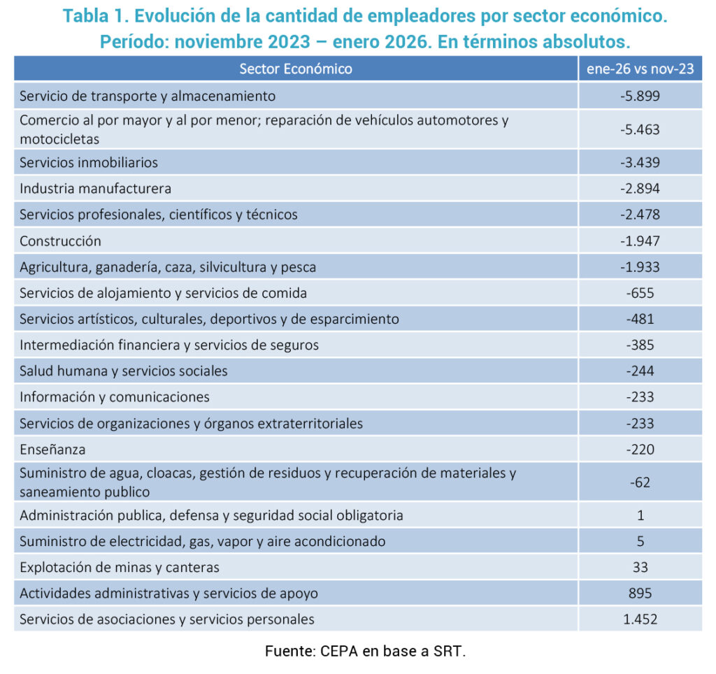 Un informe basado en datos de la Superintendencia de Riesgos del Trabajo (SRT) analizó la evolución del trabajo registrado entre noviembre de 2023 y enero de 2026. Como resultado, se evidenció que en ese período se registró una caída en la cantidad de empresas y trabajadores.