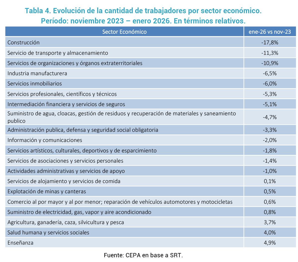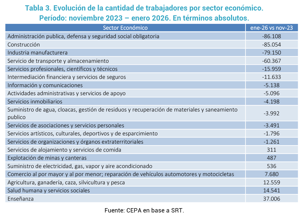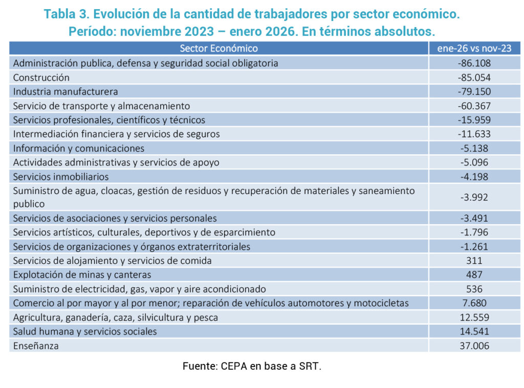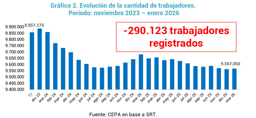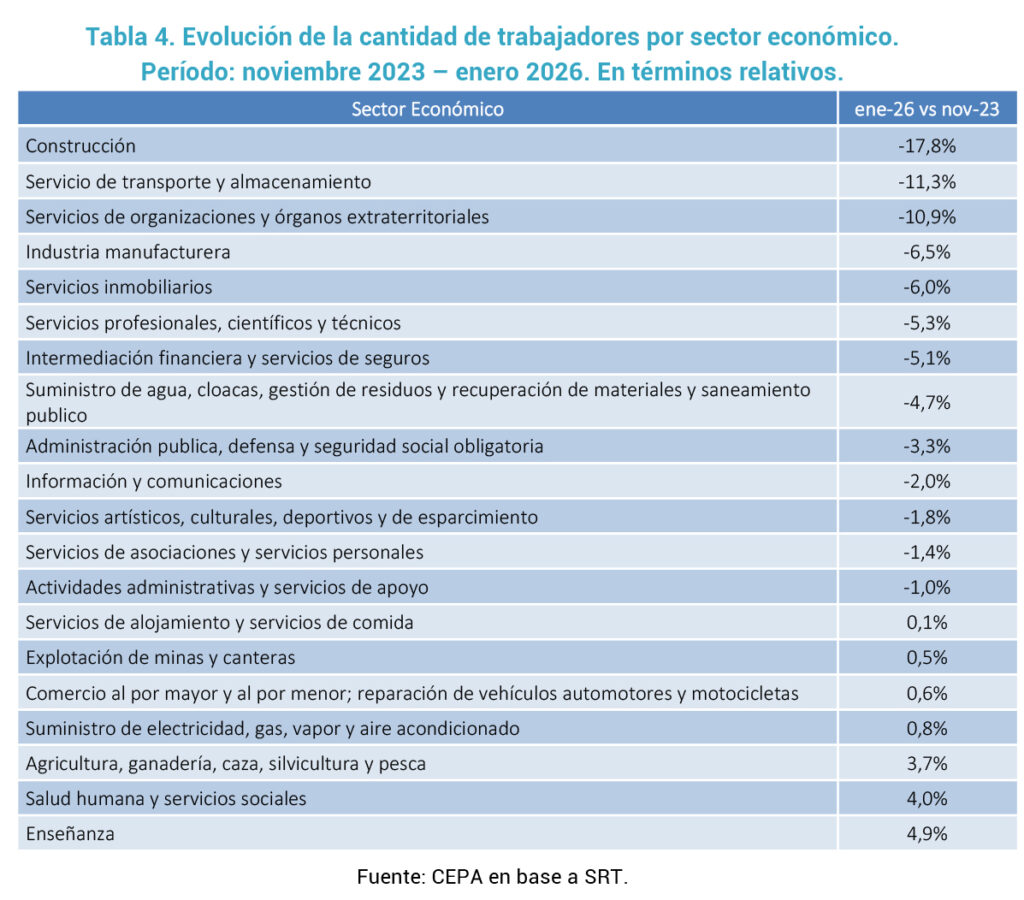 Si se considera el total del empleo privado registrado, incluyendo este sector, la caída asciende a 317.179 puestos entre noviembre de 2023 y enero de 2026.