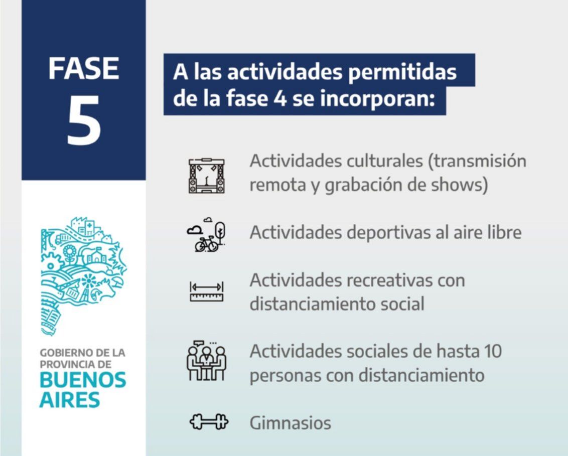 En esos lugares se permitirán las mismas actividades que en Fase 4, pero sumando: actividades recreativas con distanciamiento social, actividades deportivas al aire libre, gimnasios, actividades sociales de hasta 10 personas con distanciamiento y actividades culturales con transmisión online y grabación de shows.