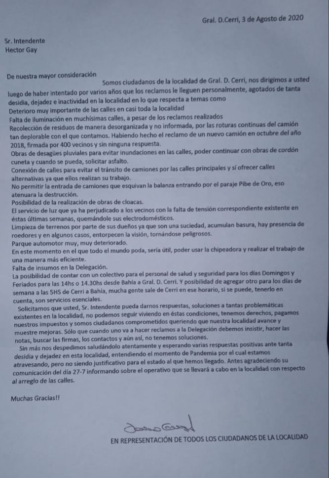 Además, emitieron un comunicado dirigido al intendente Héctor Gay, en el que indican que se llegó a esta instancia “agotados de tanta desidia, dejadez e inactividad”.