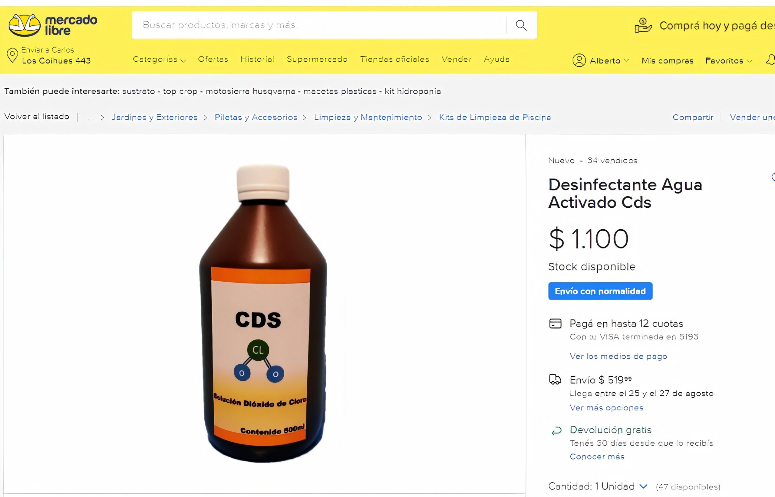 La ANMAT y Mercado Libre bajaron 400 publicaciones de venta de dióxido de cloro