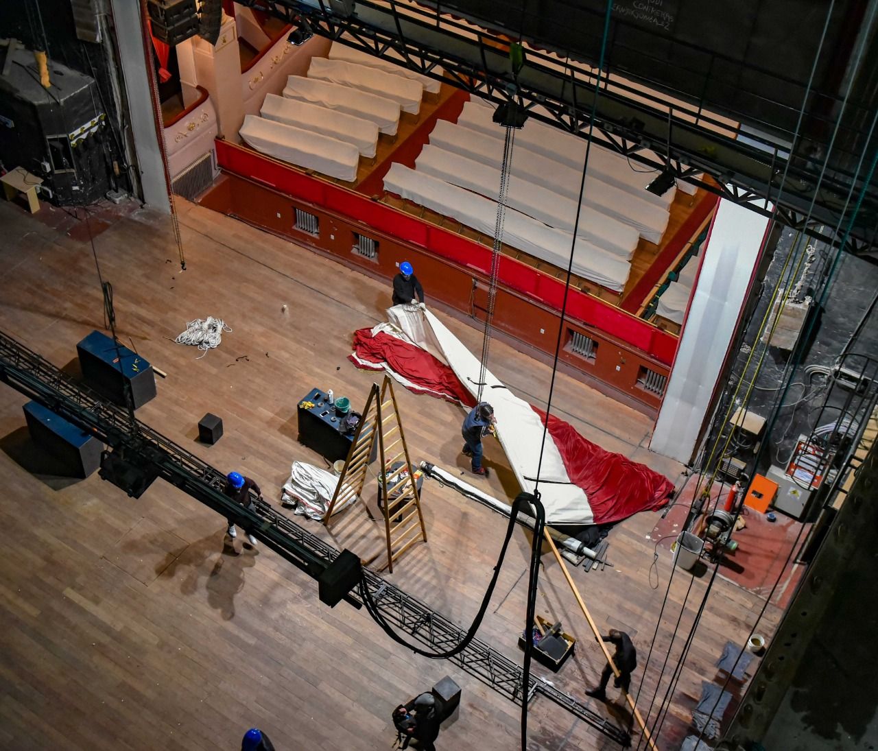 En el marco de la obra de puesta en valor del Teatro Municipal, se iniciaron los trabajos para concretar el ignifugado del telón principal, de los telones de fondo, bambalinas y patas.