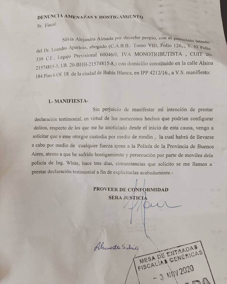 Mediante presentación judicial en sede fiscal y asesorada por su abogado Leandro Aparicio, Silvia Almada solicitó “se me otorgue custodia por medio de rondín de cualquier fuerza ajena a la Policía de la Provincia”.