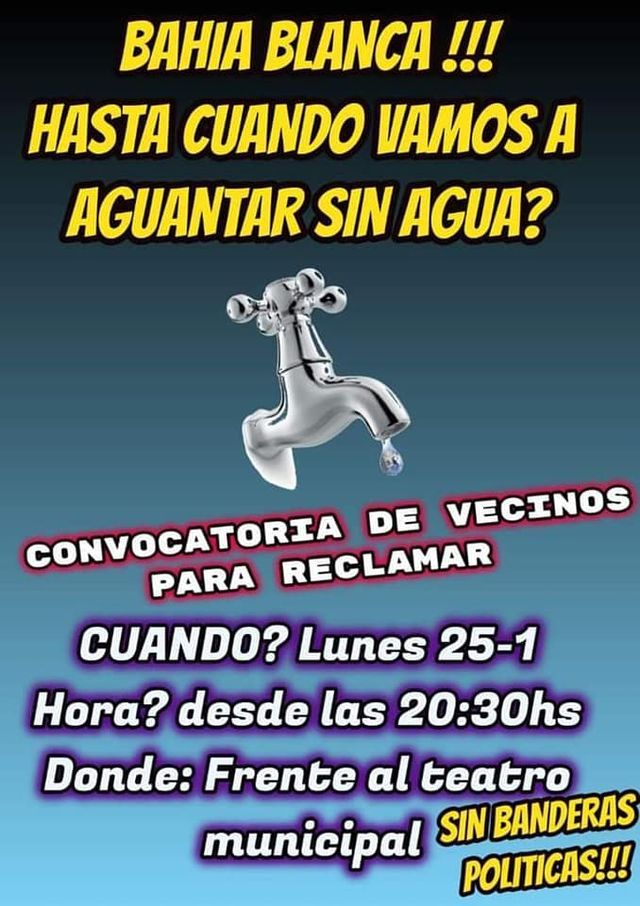 Vecinos de Bahía volverán a manifestarse esta noche por la falta de agua en distintos sectores de la ciudad.