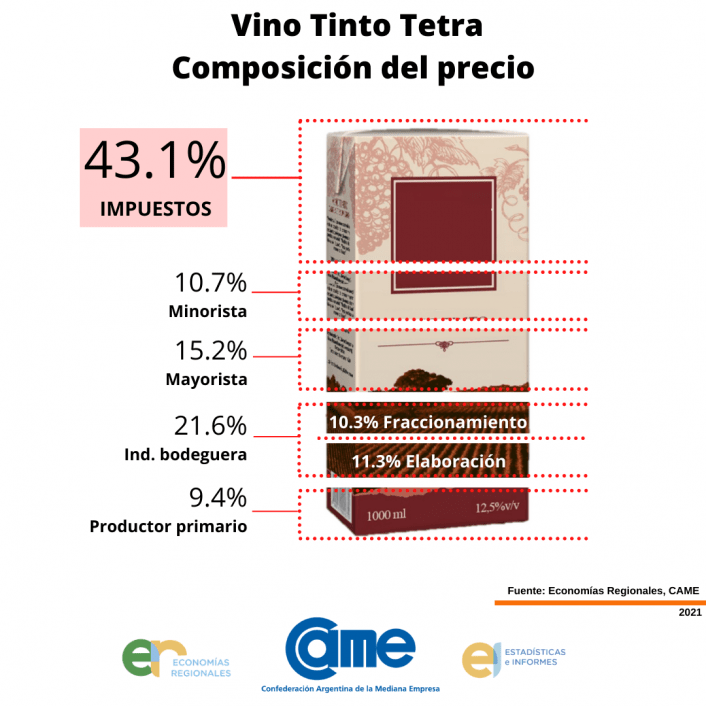 En lo que es tetra pack, y tras analizar los costos, impuestos y ganancias netas de cada eslabón, se concluyó que de los $ 88.7 en los que se vendió la caja de vino tinto gama baja en Capital Federal (precio promedio de la segunda semana de febrero 2021), el productor participa en un 9.4% del precio de góndola ($ 8.4), la industria bodeguera en 21.6% ($ 19.2), 11.3% elaboración y 10.3% fraccionamiento. El mayorista en 15.2% ($13.4), el minorista en 10.7% ($9.4), y los impuestos en 43.1% ($38.3).