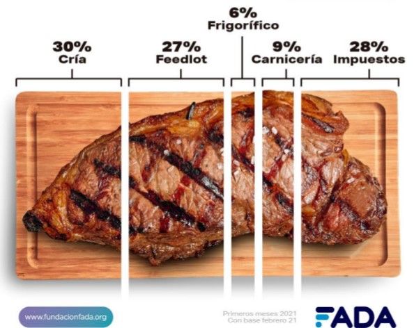 Del costo final en góndola, el 64,6 % son costos de la cadena (cría, feedlot, figorífico y carnicería), 28,1% impuestos y 7,3% ganancias.