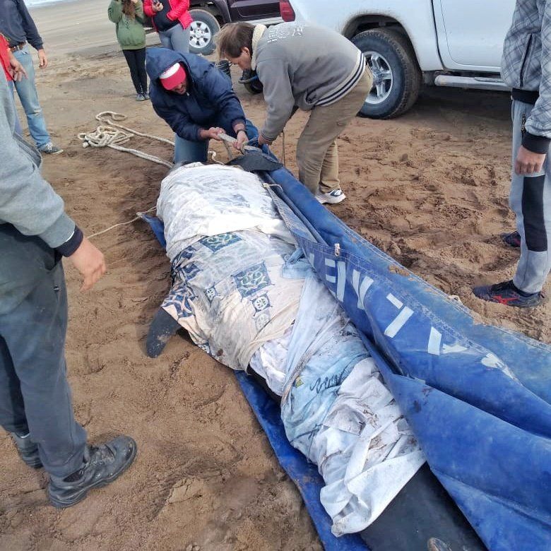 Luego de evaluar la situación, se iniciaron las maniobras de rescate que, entre otras acciones, incluyeron la colocación de una lona. Así, se logró su posterior desplazamiento hasta el sector de rompiente y ello permitió que pudiera flotar y en consecuencia reencontrarse de manera satisfactoria con su hábitat natural.