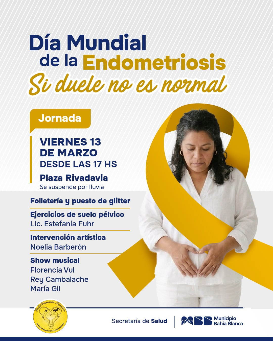 La jornada se llevará a cabo bajo el lema “Si duele no es normal”, y va a haber distintas actividades. Van a estar entregando folletos y enseñando ejercicios de suelo pélvico, y además habrá intervenciones artísticas y show musical. Se suspende por lluvia.