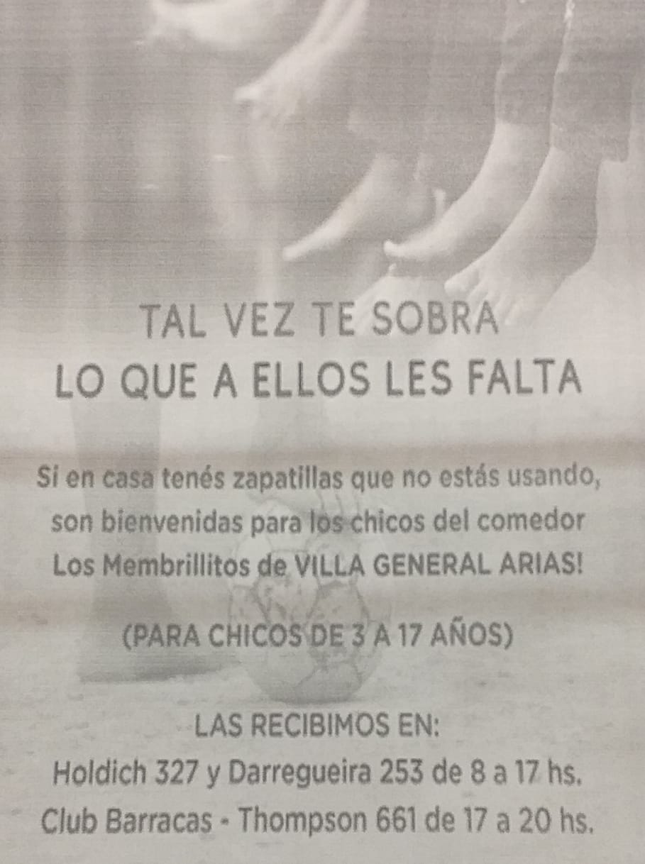 El comedor Los Membrillitos de Villa Arias inició una colecta de zapatillas.
