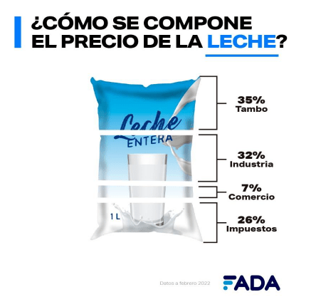 La leche entera en sachet tuvo un precio promedio de $ 106,50 por litro. De ese total, el tambo explica el 35 %, industria el 32 %, comercio 7 % e impuestos el 26 %.