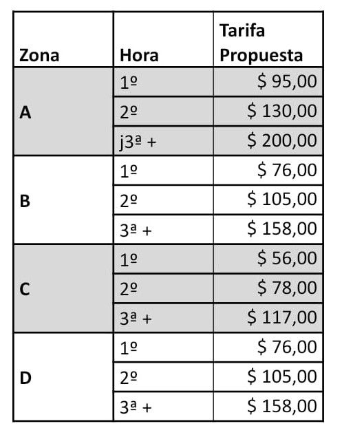 Esta establece que cada vez que se aumente el valor del boleto de colectivos, la primer hora para la Zona A, del presente Cuadro Tarifario de Parquímetro pasará a valer 1,5 el valor del boleto de colectivo (que se cobra al pasajero como Tarifa Plana para la Primera Sección) y el resto de los valores de las zonas y horas se ajustarán proporcionalmente al valor de las tablas.