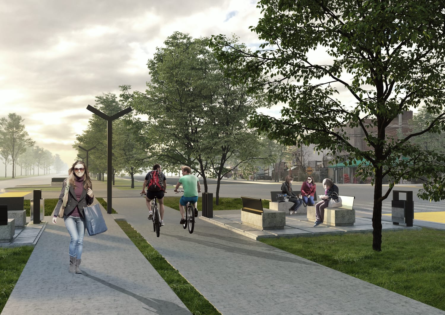 El objetivo final es hacer una calle de doble carril en ambos sentidos, de 12 metros de ancho, con veredas, dársenas y mobiliario urbano del lado comercial, y en el opuesto, una ciclovía debajo de la hilera de arbolado, y por detrás, pavimentación de la colectora y estacionamiento en 45°.