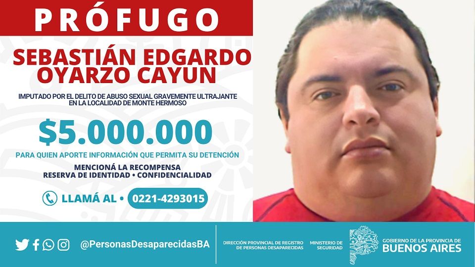 La Provincia, a través de su dirección provincial del registro de personas desaparecidas, recompensará con hasta 5 millones de pesos a quien brinde información fehaciente sobre el paradero de Sebastián Edgardo Oyarzo Cayun, imputado por el delito de abuso sexual gravemente ultrajante en la localidad de Monte Hermoso y que se encuentra prófugo.
