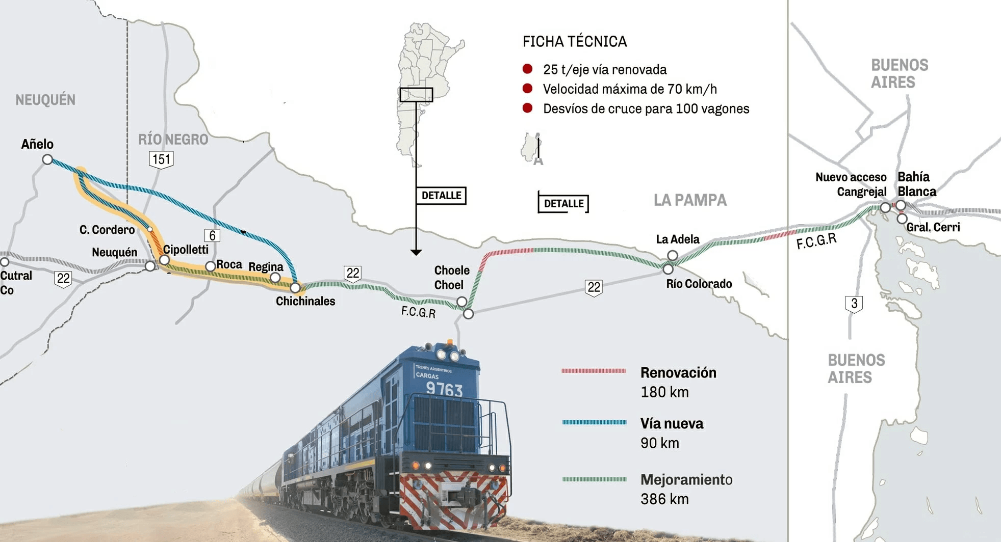 El proyecto comprende la intervención de un total de 653 kilómetros de vías, entre nuevas y recuperadas, que pertenecen al tramo Bahía Blanca-Cipolletti-Cinco Saltos-Añelo del ferrocarril General Roca.
