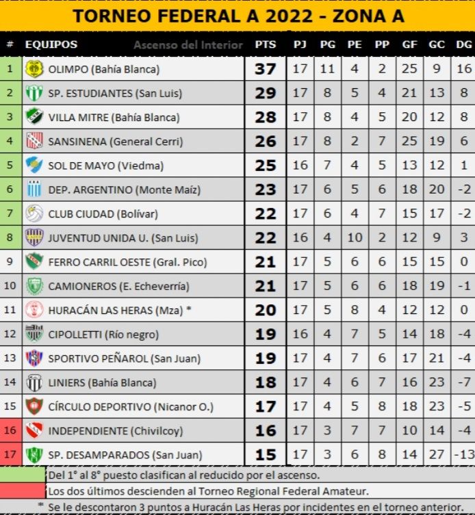 Villa Mitre cayó en Las Heras con Huracán por 2 a 1 (Nungeser), y bajó al tercer lugar de la tabla con 28 puntos, siendo relegado por Estudiantes de San Luis.