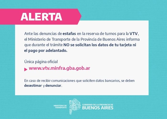 En ese aspecto, se recuerda que el único sitio oficial para tramitar un turno en las plantas de VTV de la provincia de Buenos Aires es el siguiente vtv.minfra.gba.gob.ar.