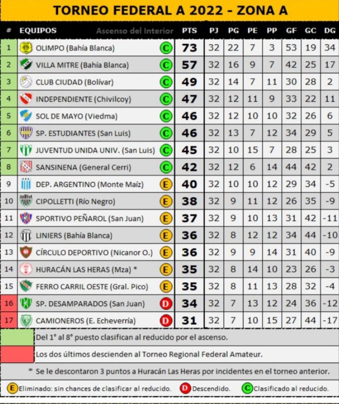 Pasadas 32 fechas, Olimpo sumó 73 puntos y fue el 1 de la zona Sur y de todo el campeonato.