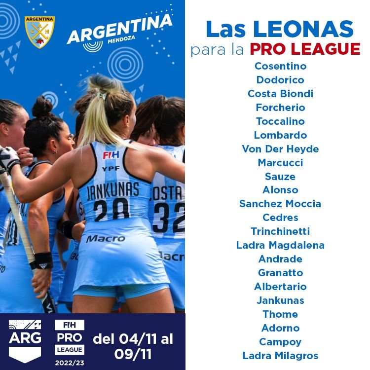 Jugará la primera etapa de la Pro League en Mendoza, del 5 al 9 de noviembre.