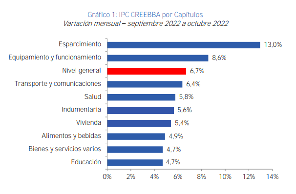 De acuerdo al relevamiento del Creebba, las subas de precios más altas se dieron en la categoría Esparcimiento, con un 13 %, seguida por Equipamiento, que alcanzó el 8,6 %, y Transporte y Comunicaciones con 6,4 %.