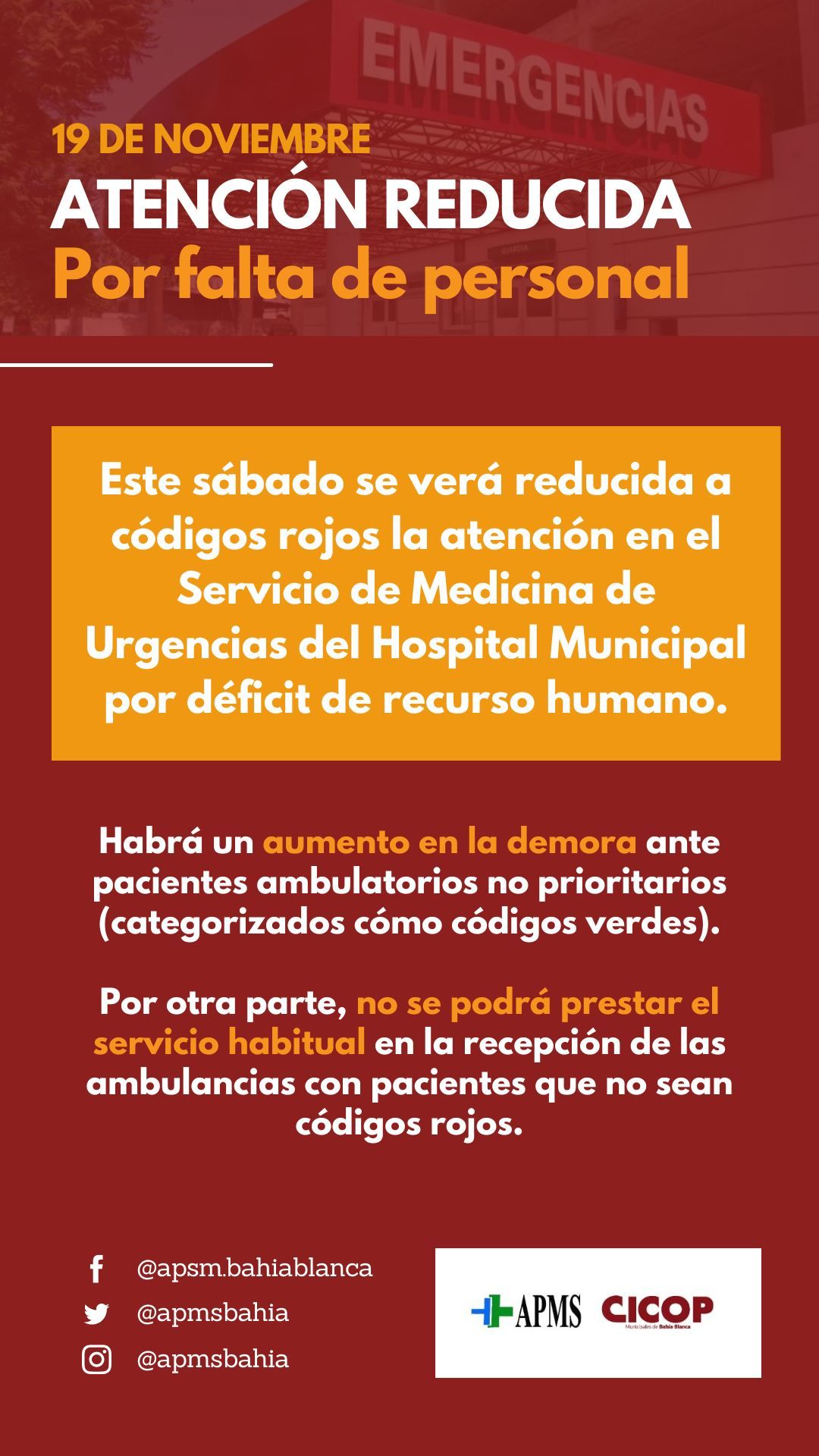 Por déficit en el recurso humano, habrá demoras en la atención de pacientes ambulatorios no prioritarios, en tanto que no se prestará el servicio habitual en la recepción de ambulancias con pacientes que no tengan riesgo de vida.