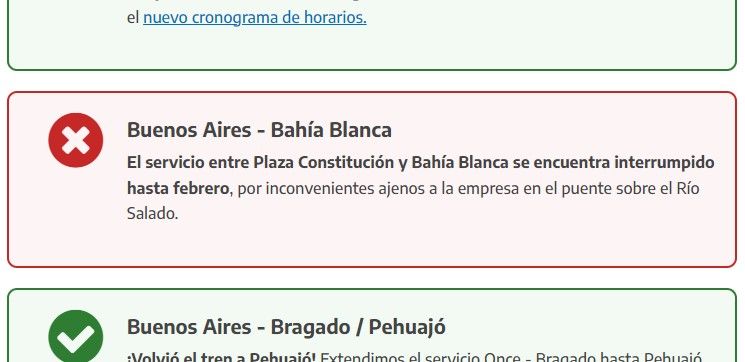 “El servicio entre Plaza Constitución y Bahía Blanca se encuentra interrumpido por inconvenientes ajenos a la empresa en el puente sobre el río Salado”, dice hoy.
