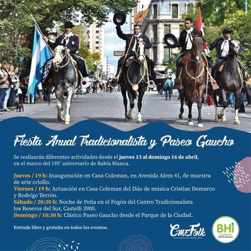 A las 7.30, será la concentración e izamiento del pabellón nacional. A las 10.30, comenzará el paseo desde el Parque de la Ciudad, por Castelli hasta el Canal Maldonado, de ahí por Zelarrayán al Centro Cultural Islas Malvinas donde estará ubicado el palco con los payadores Luis Genaro y Aarón Juárez y la animación de Martín Oviedo.
