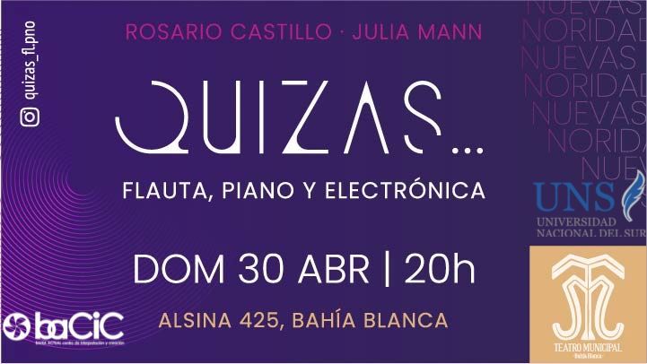 A las 20, en el Teatro Municipal, Quizás, dúo integrado por Rosario Castillo (flauta) y Julia Mann (piano) que se enfoca en la difusión de repertorio contemporáneo.