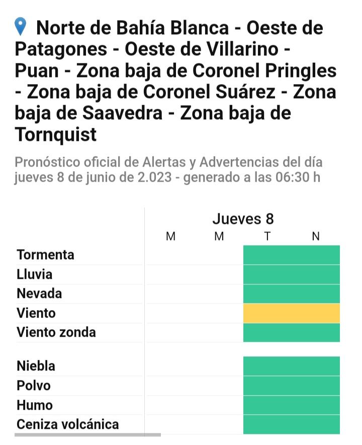 “El área sur de La Pampa y Sudoeste de la provincia de Buenos Aires será afectada por vientos del sector oeste cambiando al sector sur con velocidades entre 35 y 45 km/h, y ráfagas de hasta 70 km/h. Mientras que el Sudeste y Este de la provincia de buenos aires será afectada por vientos del Sudoeste con las mismas intensidades”, dice el alerta.