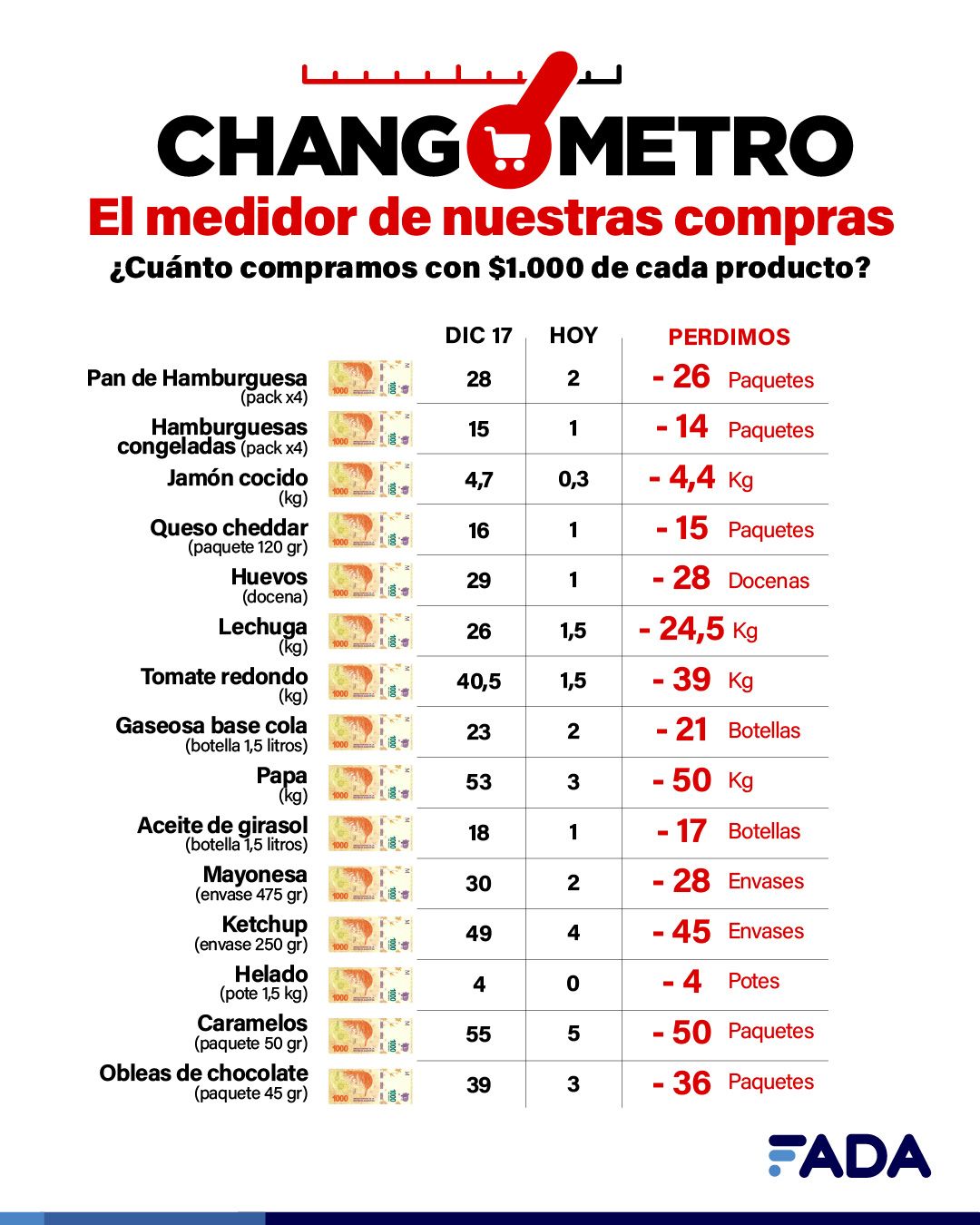 Ese combo hoy, sin contar los aumentos de estos días, sale alrededor de $ 13.320, cuando en el 2017 costaba $ 980. Según la especialista Natalia Ariño, en esos años perdimos la capacidad de comprar 50 kilos de papas, 26 paquetes de pan, 14 paquetes de hamburguesas, 50 paquetes de caramelos y 28 docenas de huevos, por ejemplo.