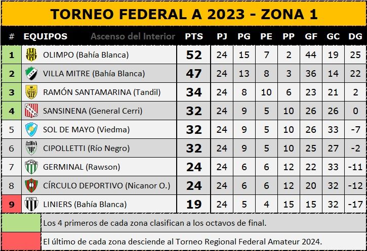 Todo sigue igual en la parte superior de la Zona 1 del Federal A, con los triunfos de Olimpo y Villa Mitre, puntero y escolta, en la fecha 27.
