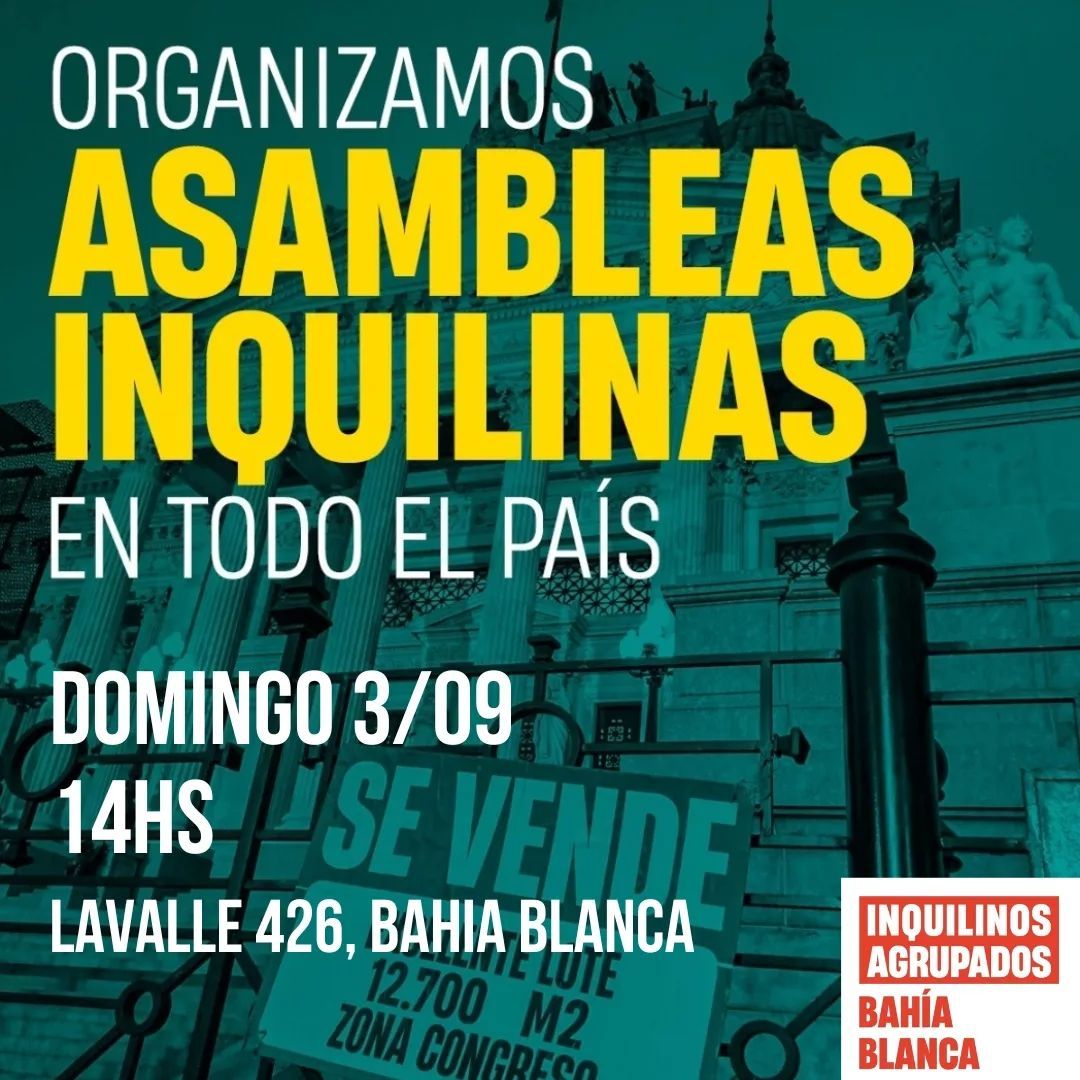 El próximo domingo, 3 de septiembre, Inquilinos Agrupados de Bahía va a hacer una asamblea para definir medidas de acción en rechazo a los cambios en la Ley de Alquileres que avanzan en el Congreso Nacional.