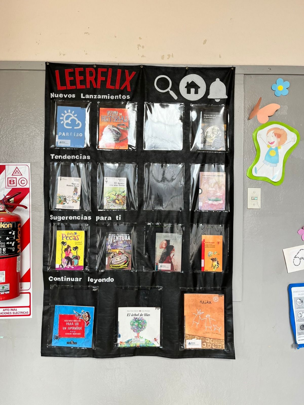 Consiste en una tela con distintos bolsillos transparentes en las que se colocan libros, y que está dividida en temáticas: nuevos lanzamientos, tendencias, sugerencias y continuar leyendo, esta última relacionada al material que los chicos vienen trabajando en las aulas.
