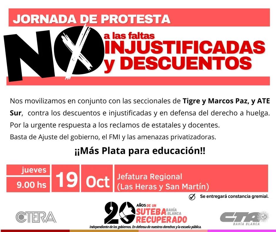 Por los descuentos por los días de paro del 3 y 4 de octubre, realizarán una jornada de protesta con movilización.
