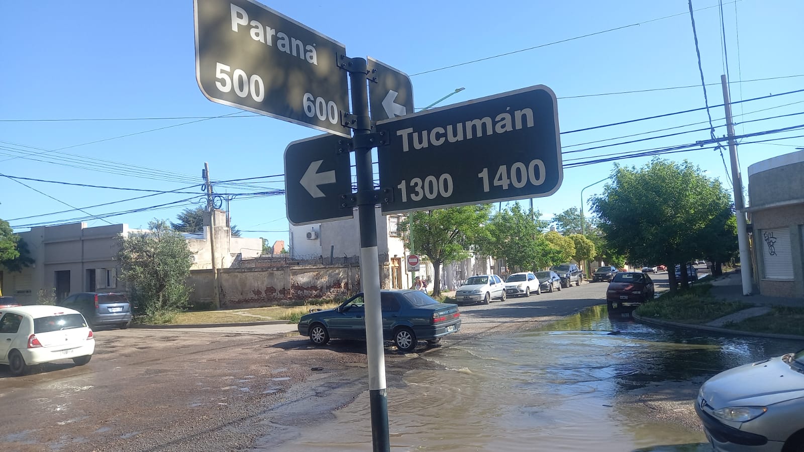 En ese sector habían rebalsado las tapas generando una especie de río de aguas servidas, con olores nauseabundos y los autos extendiendo el problema con su pasar.