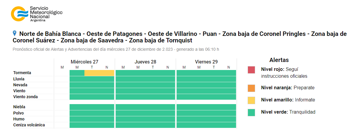 El Servicio Meteorológico Nacional emitió una alerta amarilla para hoy en Bahía.