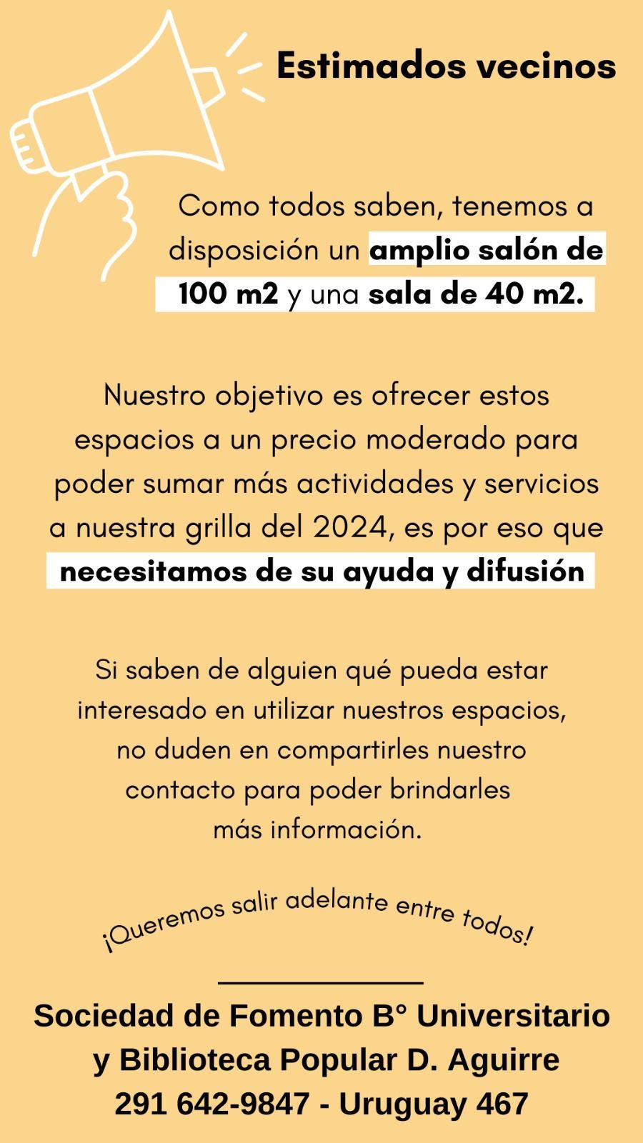 Estamos pasando una dificil situacion economica en la entidad y necesitamos promocionar los dos salones con los que contamos, para alquiler ya sea de cumpleaños, fiestas infantiles, asados (contamos con vajilla), asi como cursos, charlas, clases de idiomas.