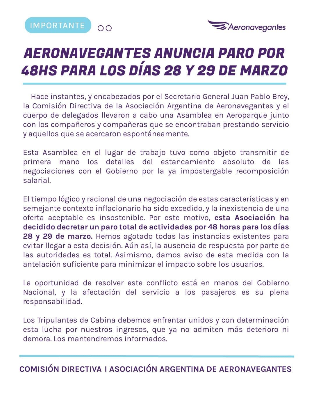 Se trata de la Asociación Argentina de Aeronavegantes que confirmó una medida de fuerza a nivel nacional para el 28 y 29 de marzo en reclamo de un aumento salarial y la falta de respuestas por parte del gobierno nacional.