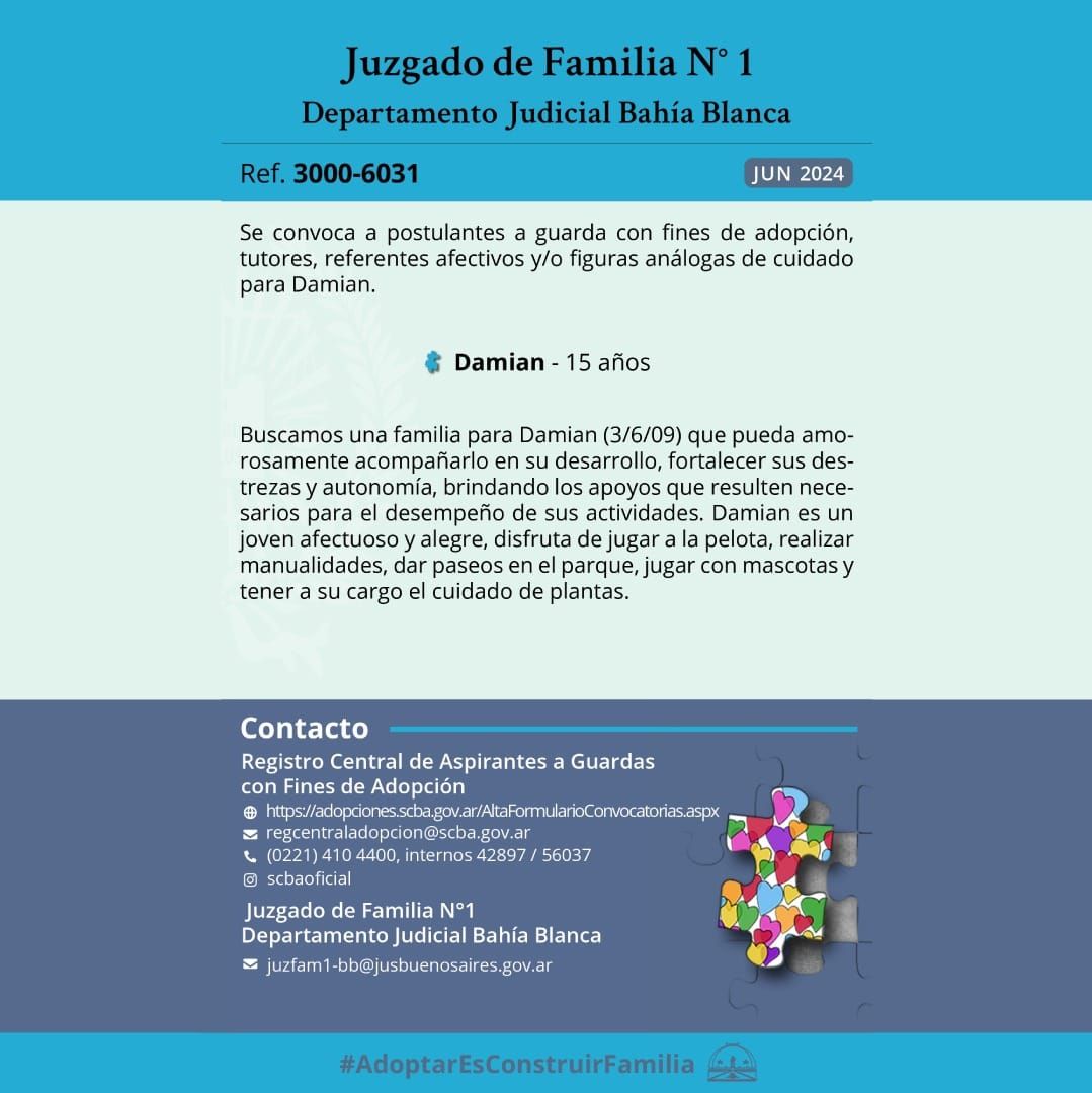 En la descripción que hace del Juzgado de Familia N° 1, indica que Damián nació el 3 de junio del 2009 y que es un joven afectuoso y alegre, que le gusta jugar a la pelota y realizar manualidades.