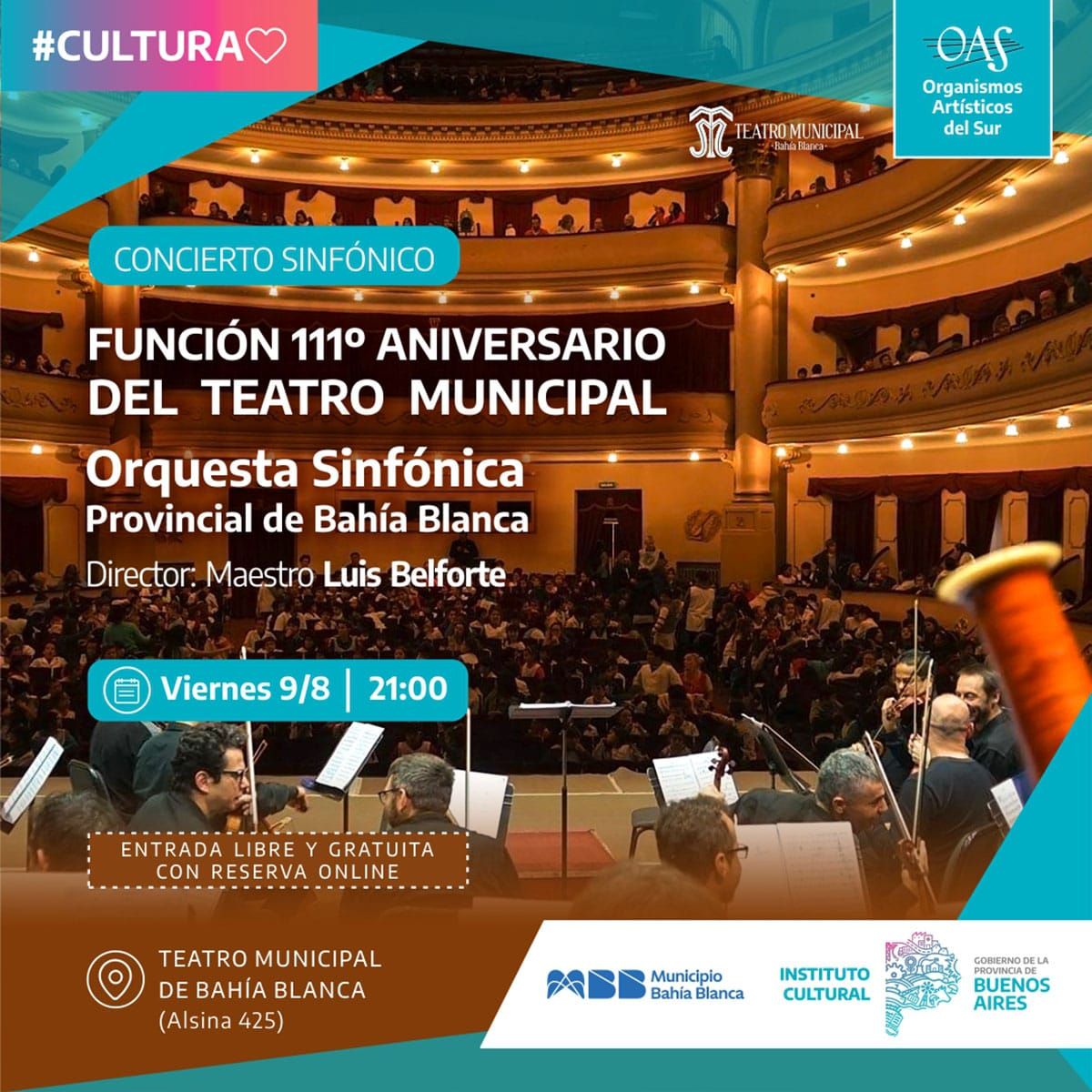 El viernes 9 de agosto la Orquesta Sinfónica Provincial dará un concierto homenaje por el 111º aniversario del Teatro Municipal.
