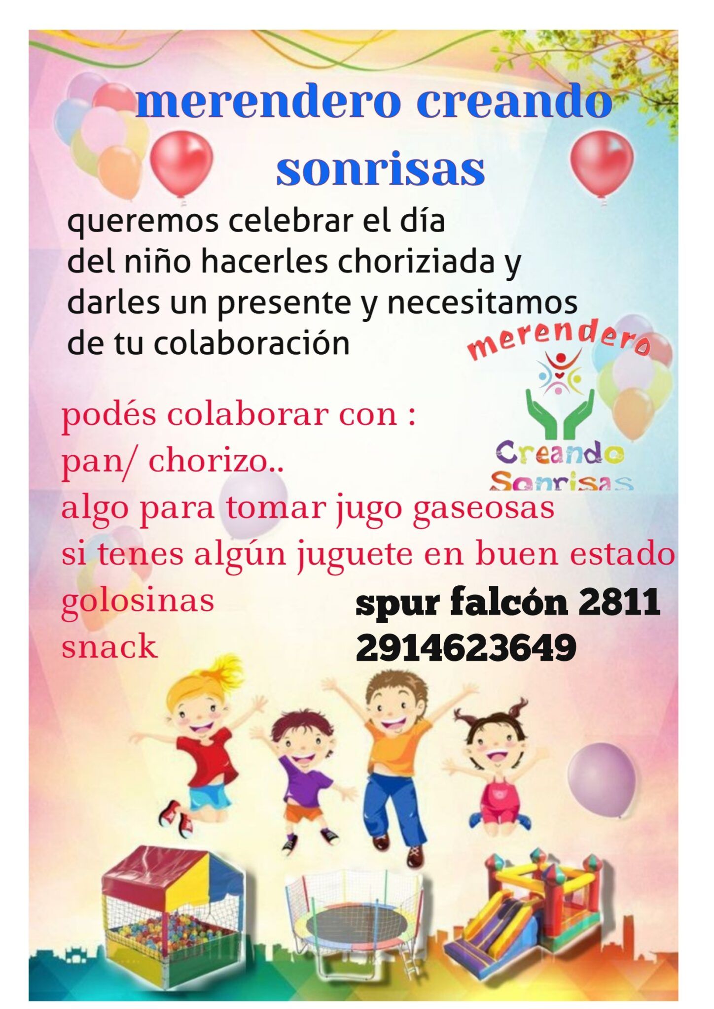 Buscamos gente que pueda colaborar con pan, chorizos, jugo o gaseosas, golosinas y snacks. Y si tienen además un juguete en buen estado, mucho mejor.