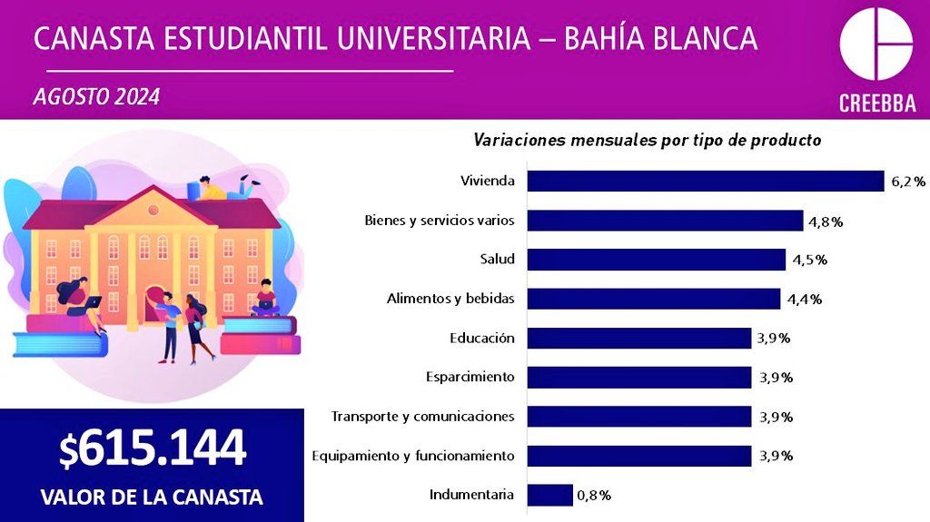 El costo de vida para los estudiantes de la Universidad Nacional del Sur (UNS) en Bahía Blanca alcanzó en agosto los 615.144 pesos, según el informe mensual del CREEBBA.
