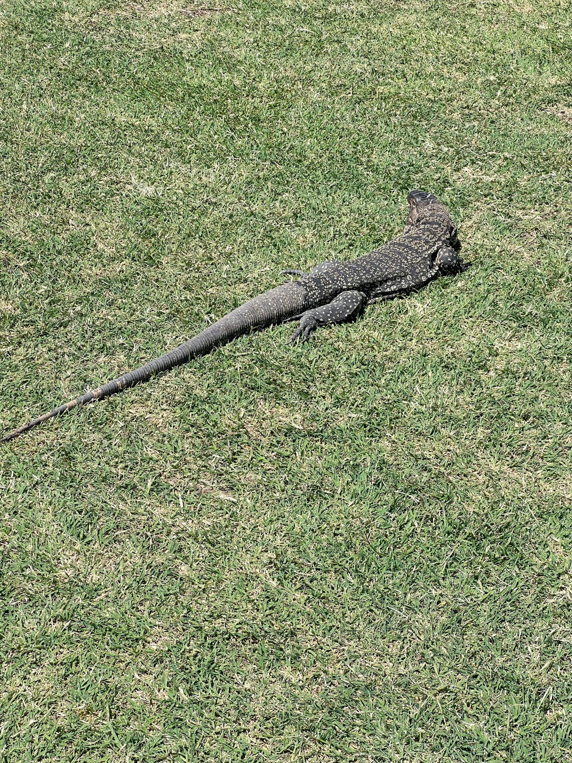 Este martes un lagarto sorprendió a quienes jugaban en el club de Golf Palihue.