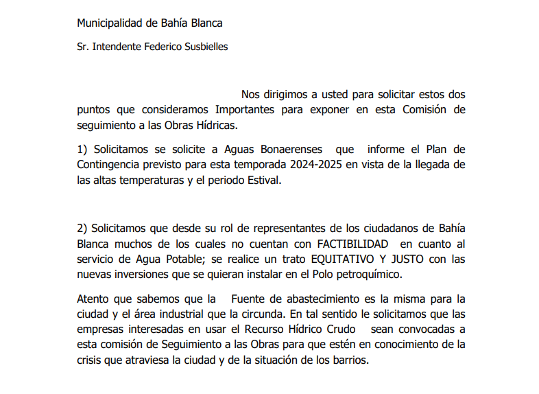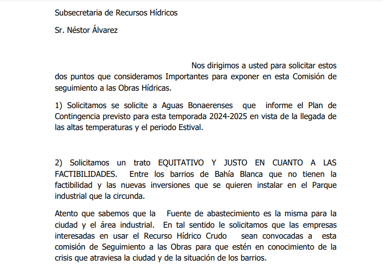 Se trata de dos notas firmadas por Angélica Lauquen, referente de los vecinos. Una dirigida al intendente Federico Susbielles y otra al subsecretario de Recursos Hídricos bonaerense, Néstor Álvarez.