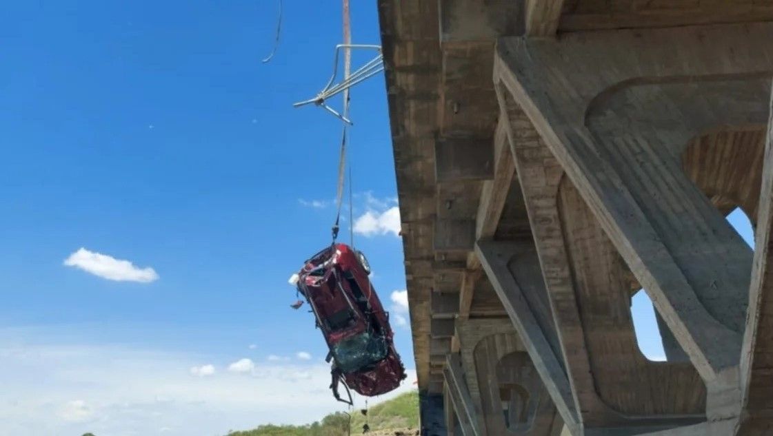 Después de varias horas se trabajo una grúa logró sacar del agua el auto que había caído al Dique Paso de las Piedras desde uno de los puentes de la ruta 51.