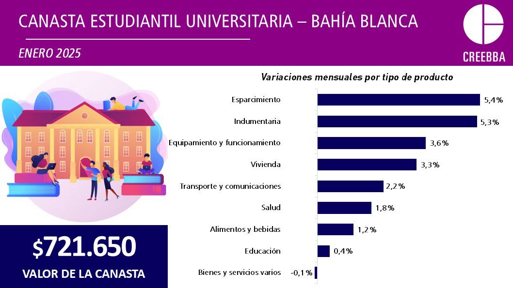 El costo de vida para los estudiantes de la Universidad Nacional del Sur (UNS) en Bahía alcanzó en diciembre los 721.650 pesos, según el informe mensual del CREEBBA.