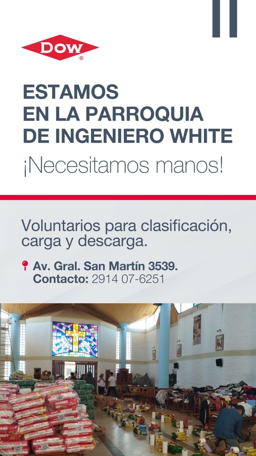 En la parroquia de Ingeniero White están necesitando voluntarios para la entrega de ropa y mercadería, de 8 a 18 horas.