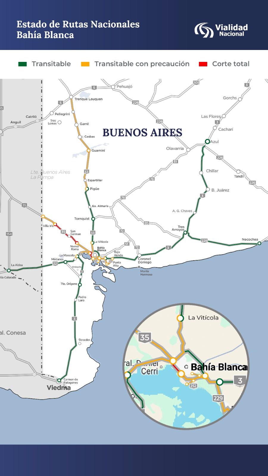 Vialidad Nacional informó que siguen cortados algunos accesos a Bahía bajo su jurisdicción.