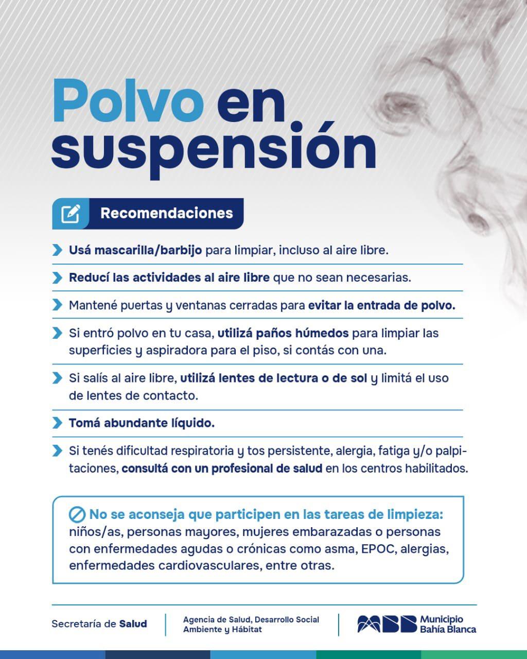 A su vez, debido al polvo en suspensión, sugieren el uso de barbijo, especialmente en personas con problemas respiratorios.